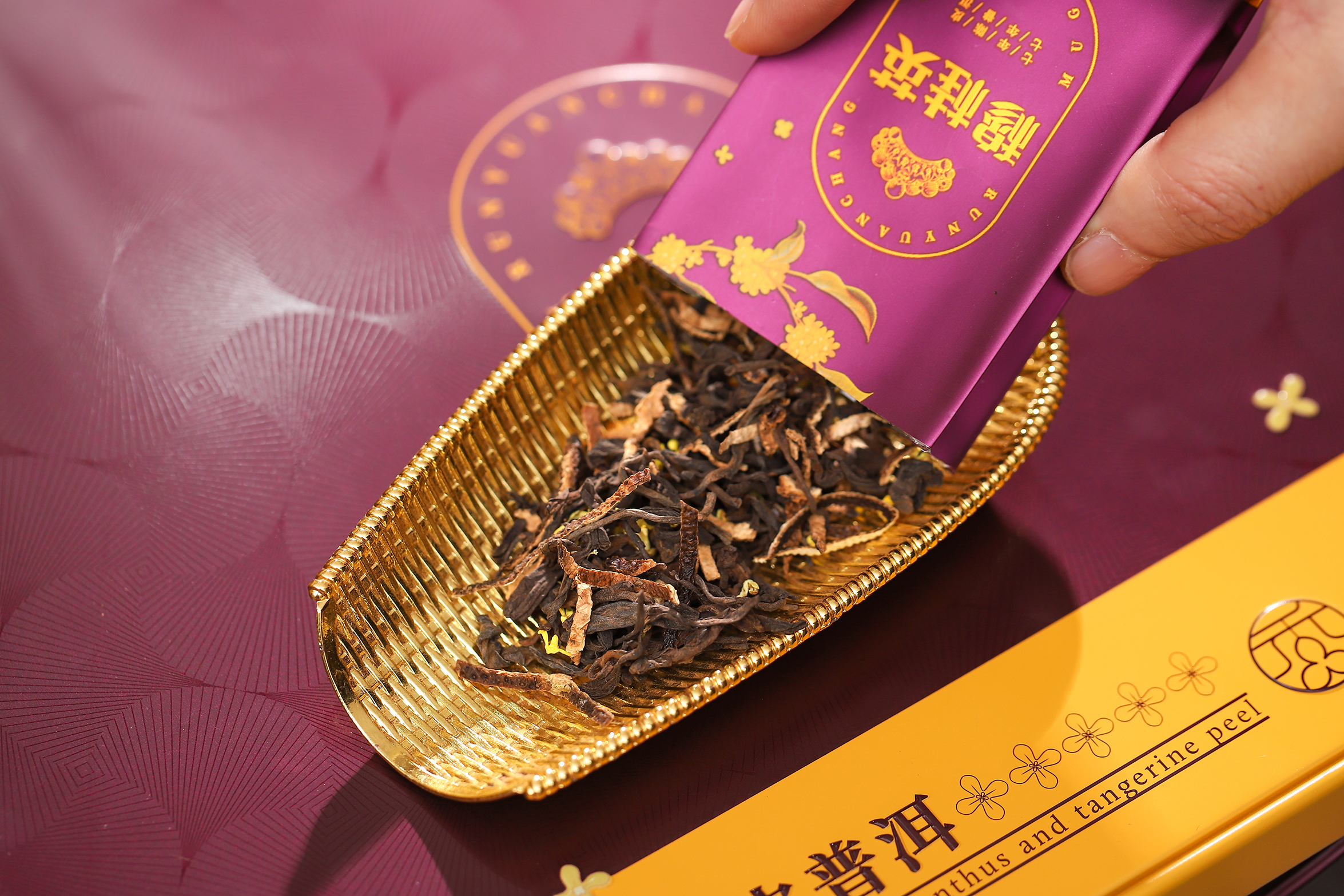 用料:2023年广西桂林金桂(5A特级)、7年陈广东新会核心产区陈皮切丝、7年陈云南勐海春茶发酵的熟茶